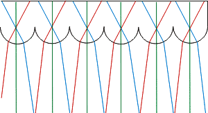 Panoramic lenticular images differ from usual post cards or visit cards. The panoramas are very broad. For that case, optical scheme is Fig. 1b. Look at the left figure 3. You can see that interlaced image period depends on viewing point. If viewing distance decreases, the period increases.