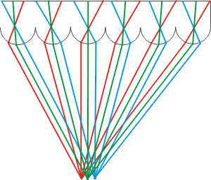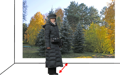 Panoramic lenticular images differ from usual post cards or visit cards. The panoramas are very broad. For that case, optical scheme is Fig. 1b. Look at the left figure 3. You can see that interlaced image period depends on viewing point. If viewing distance decreases, the period increases.
